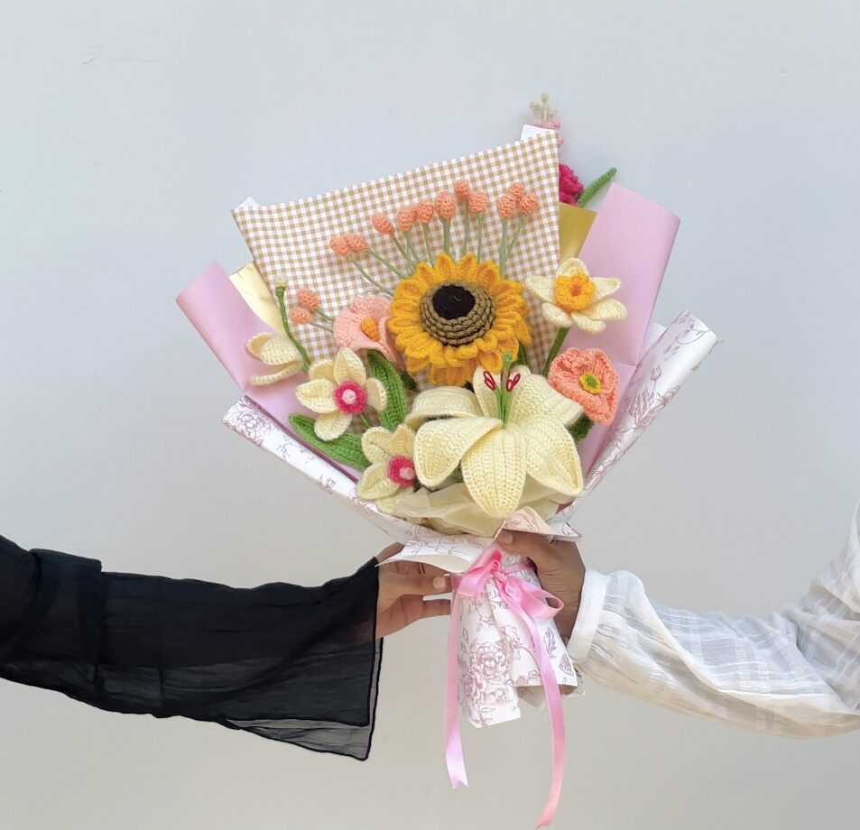 A bright and charming bouquet featuring orchids, lilies, sunflowers, peace lilies, daffodils, poppies, and soft buds in a warm mix of peach, yellow, and pink. This handcrafted arrangement brings a radiant glow to any moment. Available with optional fairy lights for a magical touch—perfect for birthdays, celebrations, or just because. A cute and cheerful gift that says it all.